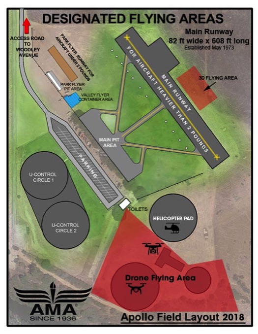 Apollo XI Model Field, located at 6201 Woodley Ave, Encino, CA, is a public park dedicated for radio-controlled model aircraft. The field features multiple designated areas for different types of aircraft, including fixed-wing planes, helicopters, drones, and control line models. The main runway, created in 1973, is 82 feet wide and 608 feet long, catering to fixed-wing aircraft weighing over one pound. Apollo XI Field is not FRIA, however the San Fernando Valley Flyers Club has FAA RIDE - Remote ID Exception.